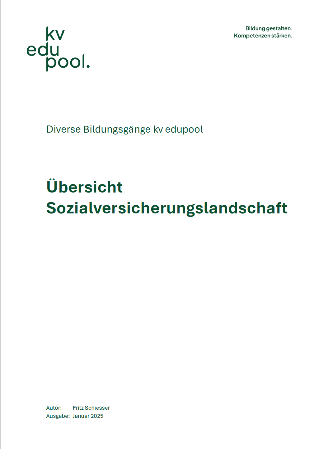 Dieses Lehrmittel ist kein umfassendes Gesamtwerk über die Sozialversicherungen in der Schweiz, sondern dient als Übersicht der Sozialversicherungslandschaft in der Schweiz für verschiedene Bildungsgänge von kv edupool. Es soll den Studierenden einen ersten Überblick der verschiedenen Sozialversicherungen verschaffen. Der erste Teil beinhaltet eine grobe Übersicht über die Sozialversicherungslandschaft in der Schweiz und deren Entwicklung. Im zweiten Teil werden die einzelnen Sozialversicherungen in den Grundlagen beschrieben, insbesondere werden der Zweck, die Organisation, die versicherten Personen, die Beiträge und die Finanzierung wie auch die Leistungen der jeweiligen Sozialversicherung kurz erklärt. Das abschliessende Kapitel zeigt die Unterschiede, aber auch die Gemeinsamkeiten von Sozial- und Privatversicherungen auf.